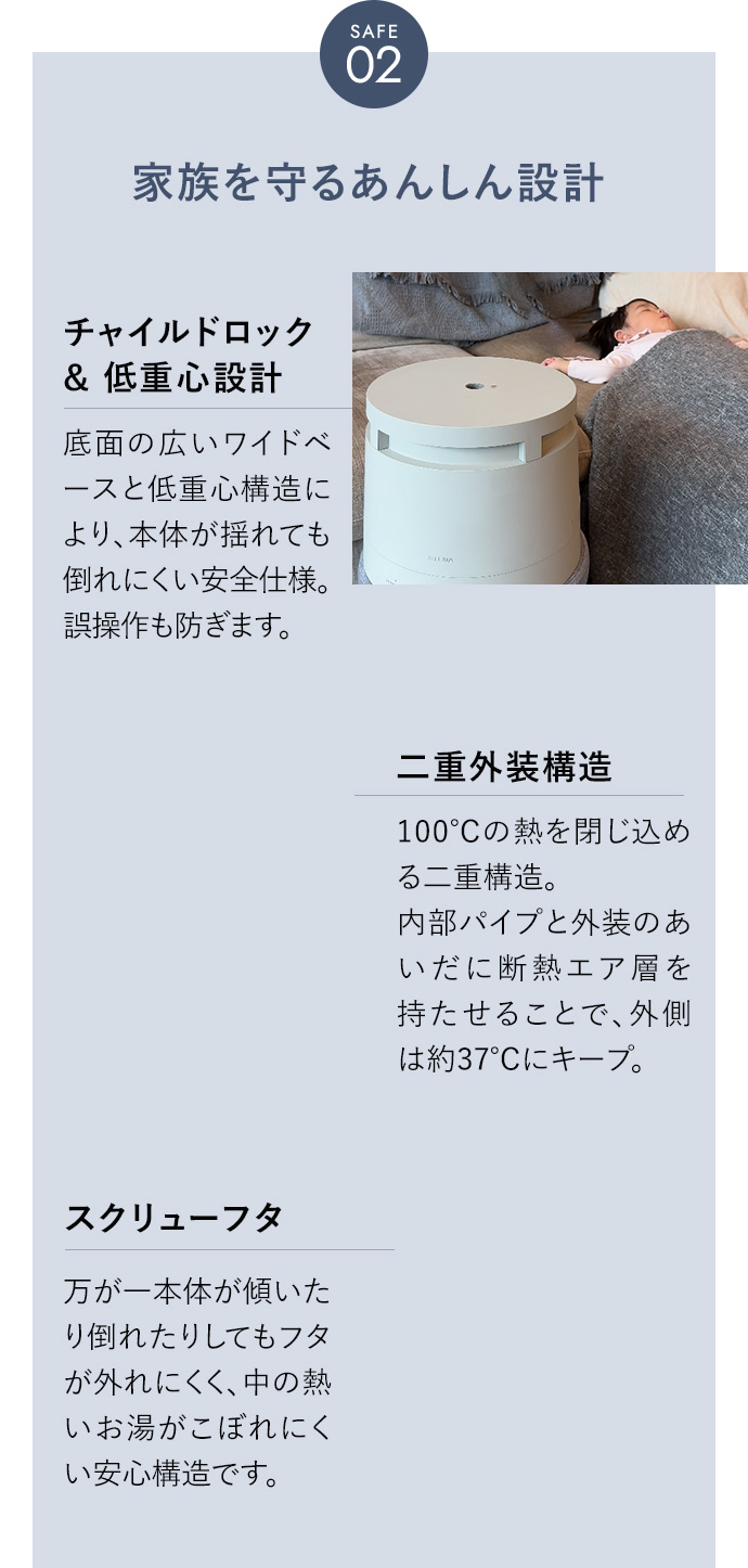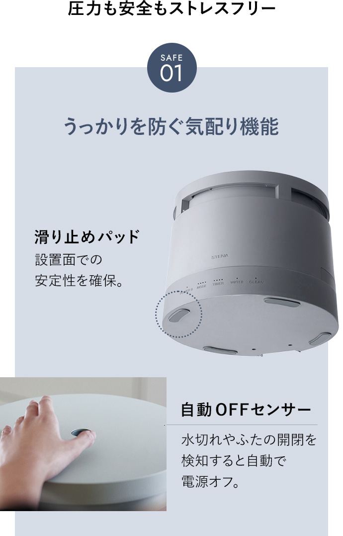 STENAはスチーム式では類をみない”スチーム圧制御バルブ”を搭載しているため、水飛びで高温のお湯が吹き出すことがなく、表面が熱くなることもないので、小さなお子様やペットがいても安心です。また、チャイルドロック機能により誤操作を防ぎます。