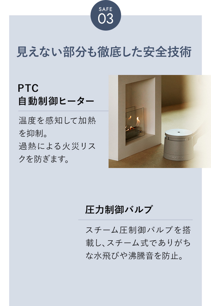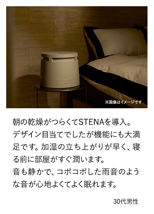 STENAはターボモードでも33dBと図書館ほどの静かさで、就寝時も快適にご使用いただけます。スチーム式でよくある沸騰音も、心地よい雨音のような音で、リラックス効果を感じていただけます。